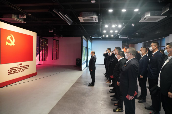 在中共蘇州獨立支部舊址,黨員們走過“燃血青春”中共蘇州獨立支部史跡陳列展示區(qū)、“青春我行”實踐活動體驗區(qū)、“青春劇場”多功能廳,通過聆聽革命先烈的光輝事跡、沉浸式體驗革命年代的艱苦歷程,系統(tǒng)回顧了中共蘇州獨立支部的創(chuàng)建背景、發(fā)展過程及影響意義,深刻感悟中共蘇州獨立支部的發(fā)展史、革命史和奮斗史,在恢宏磅礴的歷史畫卷中感悟著共產黨人堅定的理想信念。隨后,在“青春誓言”宣誓區(qū),全體黨員在牛春雷的帶領下面對黨旗莊重宣誓,重溫入黨誓詞,切實用紅色文化滋養(yǎng)初心、淬煉品行。