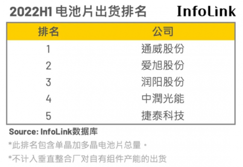 據(jù)PVInfoLink統(tǒng)計,今年上半年晶硅電池總產(chǎn)量約135.5GW。TOP5的通威股份、愛旭股份、潤陽股份、中潤光能、捷泰科技,總出貨量約59GW,占43.54%。另有投研機構統(tǒng)計,TOP5出貨中,通威出貨約為22.5GW、愛旭出貨約為17GW、潤陽出貨約為13GW、中宇出貨約為5GW,捷泰出貨約為3GW。