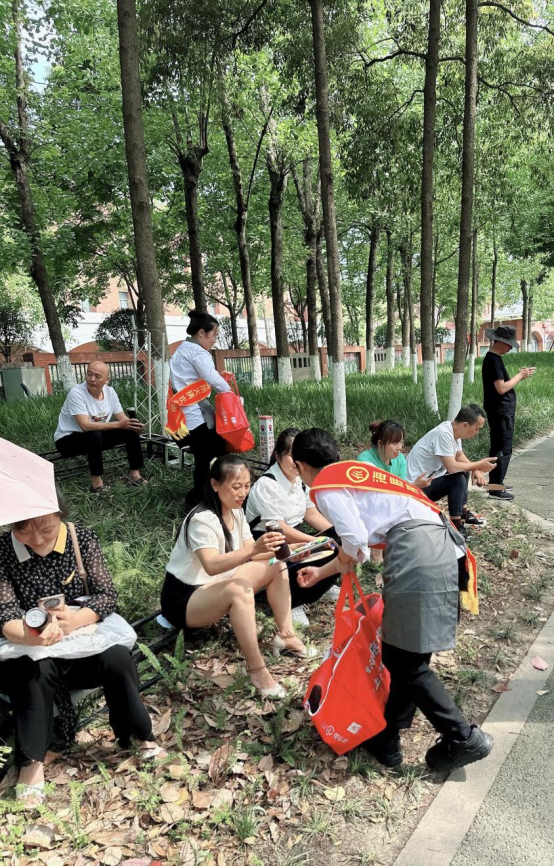 “天氣太熱了,喝點(diǎn)楊梅汁解解暑吧,祝您的孩子馬到功成,前程似錦!”在成都市新都中學(xué)高考考點(diǎn)門前,來自海底撈七一廣場店的志愿者員工們向等候的家長送上清涼解暑的飲品和小扇子。