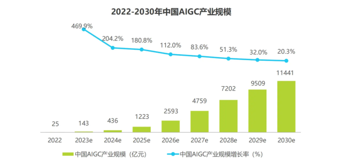 報(bào)告指出,2023年中國(guó)AIGC產(chǎn)業(yè)規(guī)模約為143億元,隨后進(jìn)入大模型培育期,持續(xù)打造與完善底層算力基建、大模型商店平臺(tái)等新型基礎(chǔ)設(shè)施,以此孕育成熟技術(shù)與產(chǎn)品形態(tài)并將其對(duì)外輸出。到2030年中國(guó)AIGC產(chǎn)業(yè)規(guī)模有望突破萬(wàn)億元,達(dá)到11441億元。