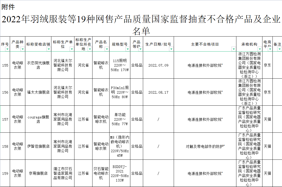 近日,市場(chǎng)監(jiān)管總局通報(bào)了2022年羽絨服、電動(dòng)晾衣架等19種網(wǎng)售產(chǎn)品質(zhì)量國(guó)家監(jiān)督抽查情況。結(jié)果顯示,2022年度電動(dòng)晾衣架抽查不合格率高達(dá)46.2%,為19種抽查產(chǎn)品中最高。