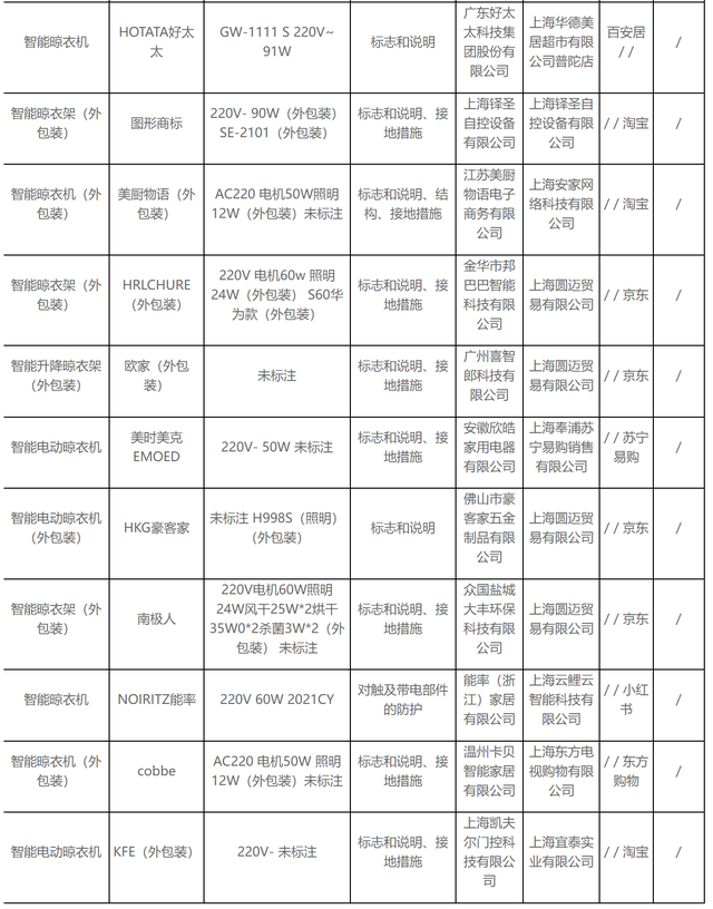 無(wú)獨(dú)有偶,據(jù)上海市市場(chǎng)監(jiān)督管理局發(fā)布的2022年上海市產(chǎn)品質(zhì)量監(jiān)督抽查結(jié)果(第十批)顯示,11批次智能晾衣架抽查不合格,其中涉及HOTATA好太太、美時(shí)美克EMOED、南極人等品牌。