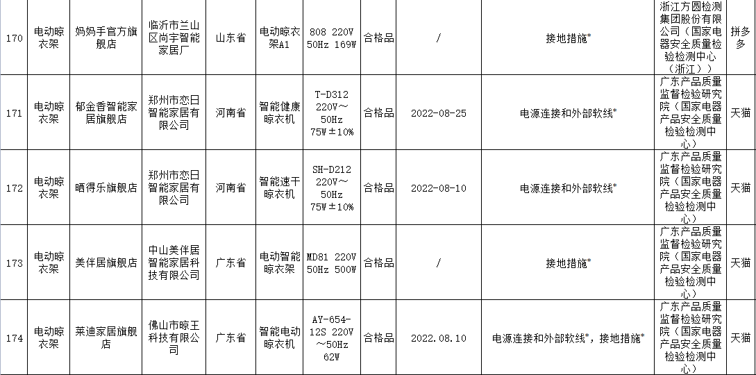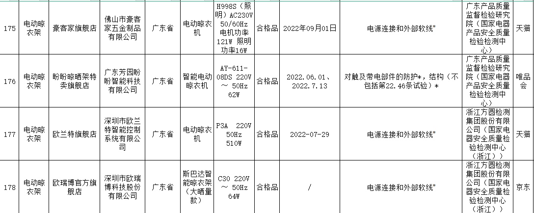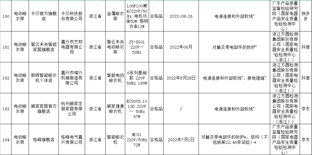 本次電動(dòng)晾衣架抽查檢驗(yàn)9個(gè)省(市)48家企業(yè)生產(chǎn)的52批次產(chǎn)品,包括天貓、京東、拼多多、抖音等電子商務(wù)平臺(tái),發(fā)現(xiàn)24批次產(chǎn)品不合格,涉及卡瑞琪(courage)、顧家、格峰、盼盼、歐蘭特等品牌。